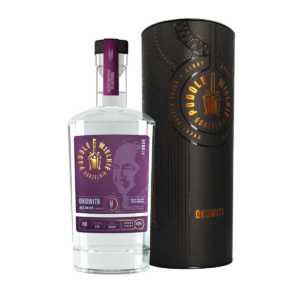 • Zdjęcie przedstawia Butelkę okowity Podole Wielkie Gryka Edycja Limitowana rocznik 2024 z ozdobną tubą prezentową